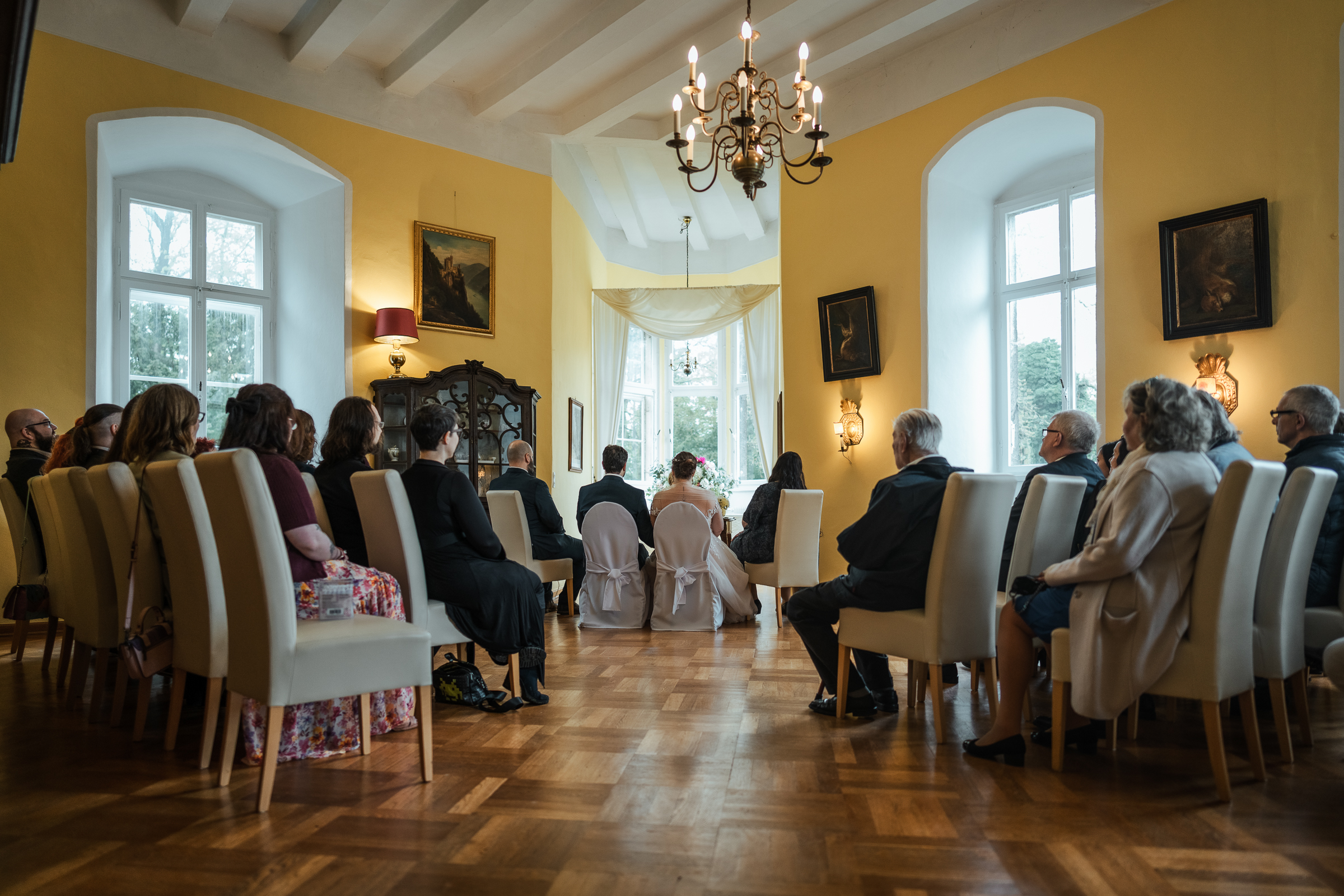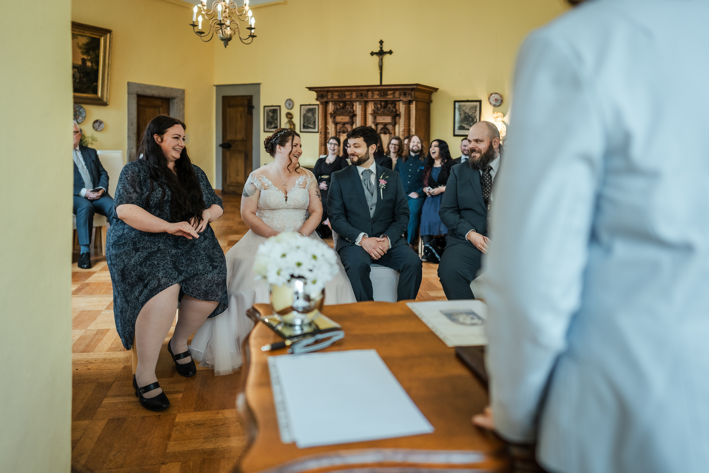 Begleitet wurden Sara und Tim von ihren besten Freunden Tine und MJ, die ihnen als Trauzeugen zur Seite standen. Umringt von Familie und Freunden war die Atmosphäre während der Trauung warm, vertraut und voller Freude. Die historische Burg bot dabei einen besonders feierlichen Rahmen für diesen bedeutenden Moment.