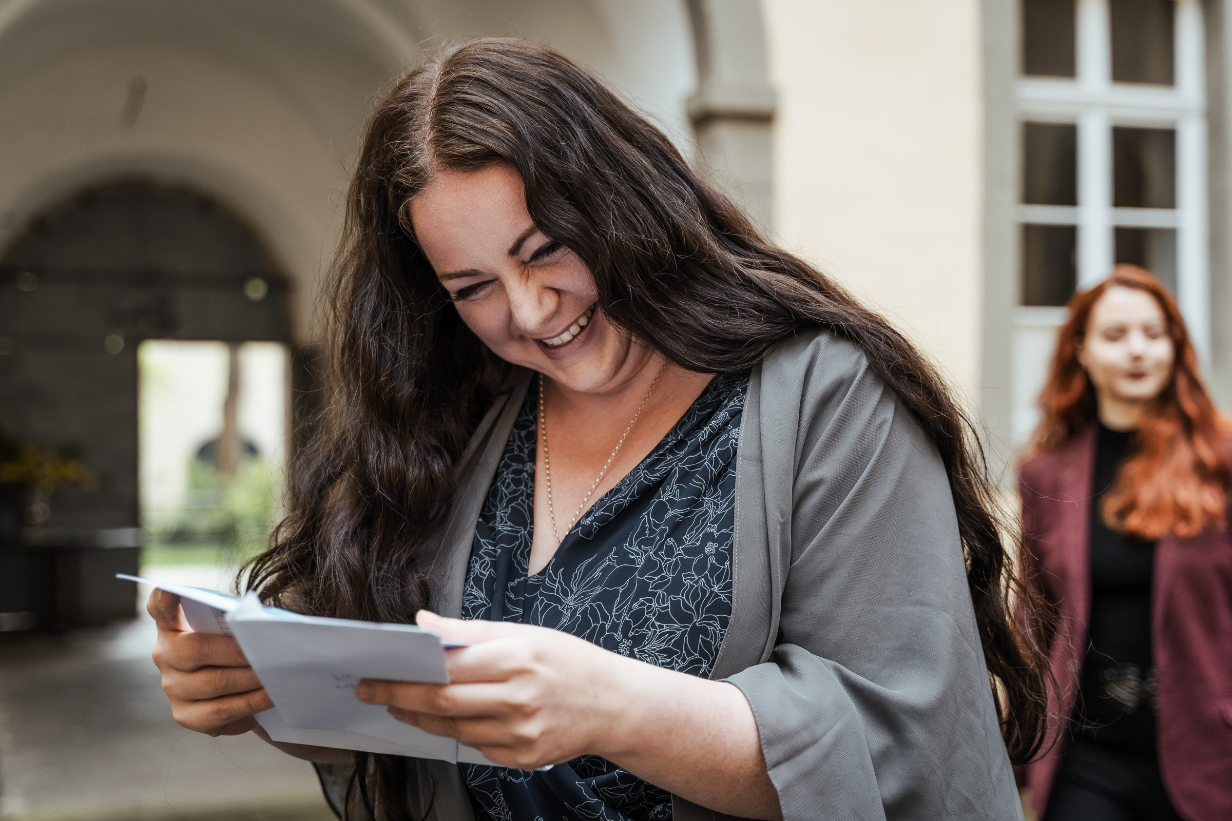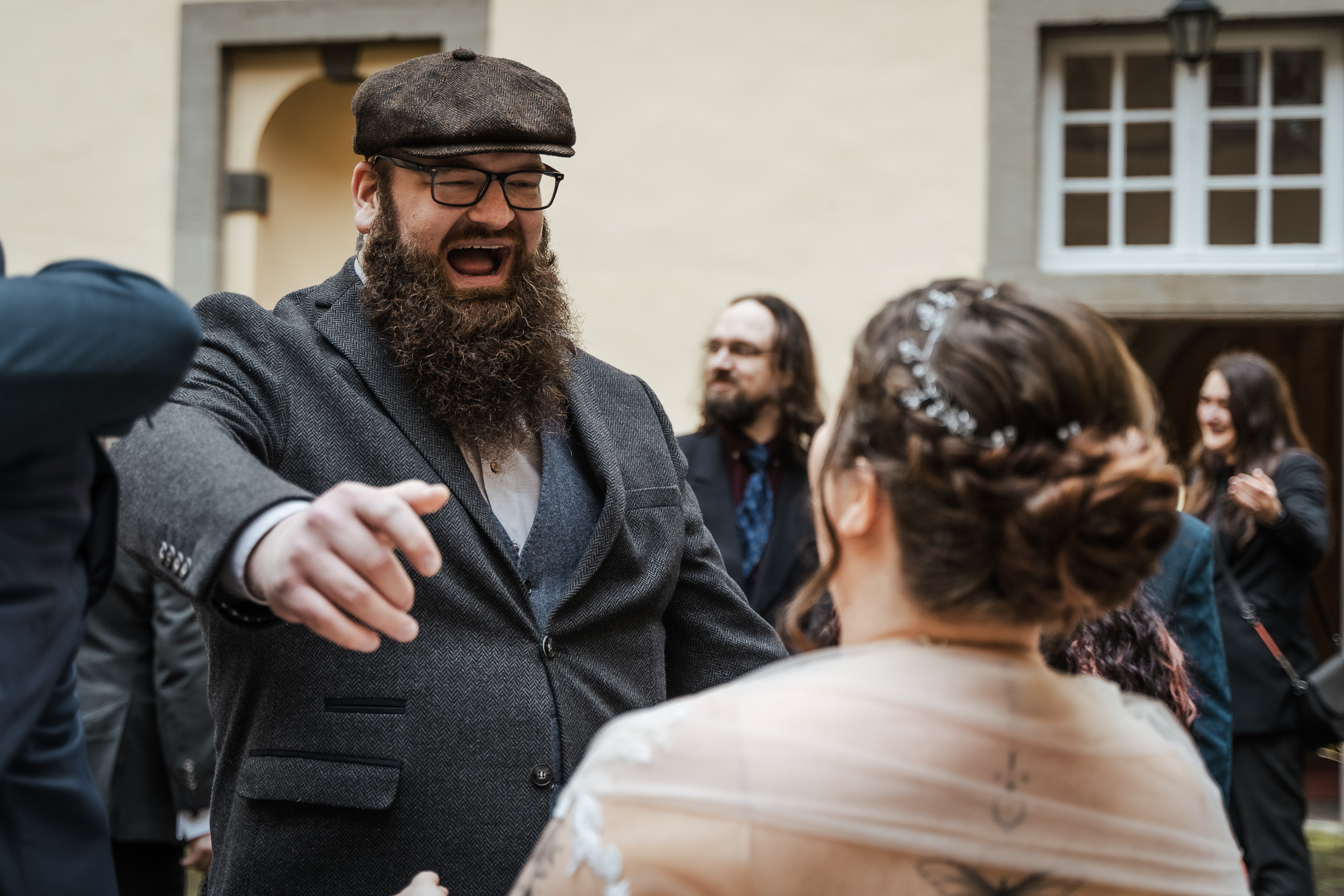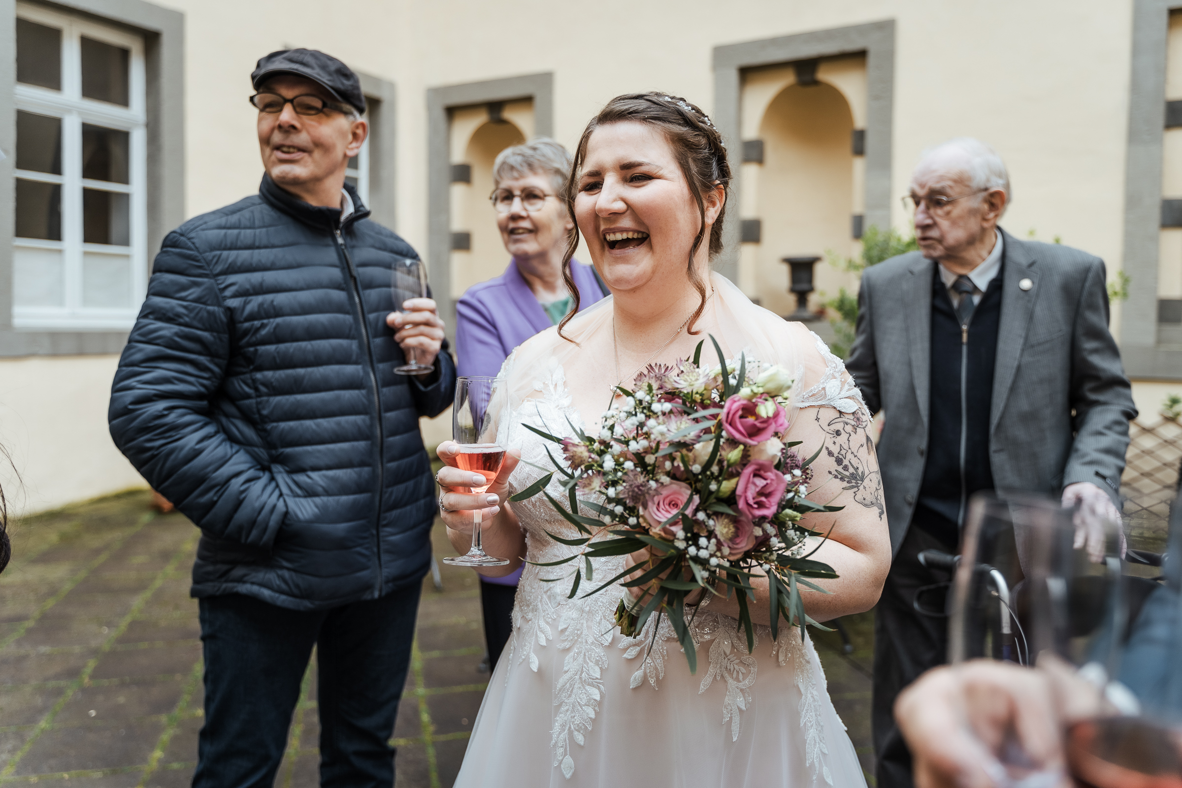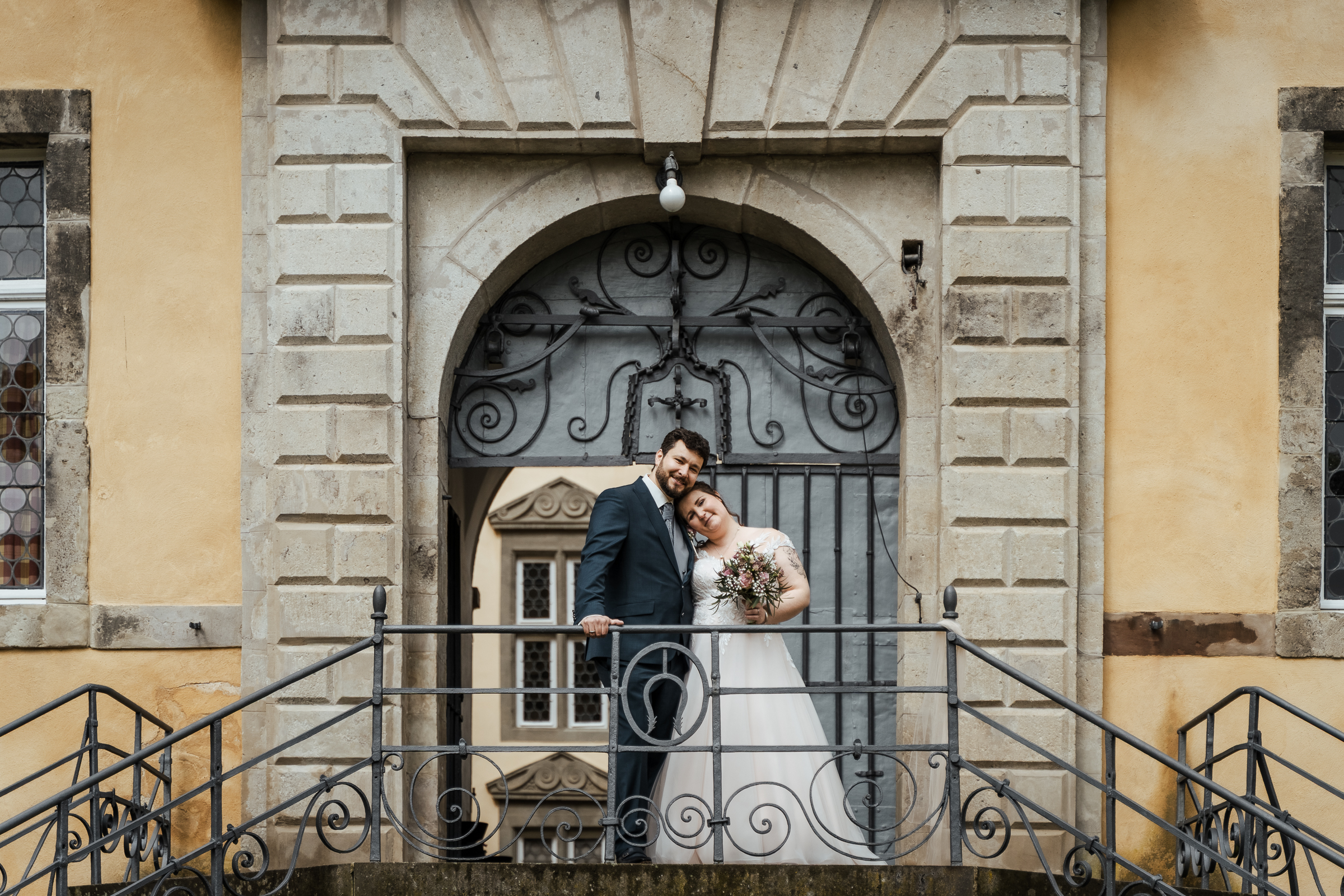 Nach der Trauung nahmen sich die Gäste Zeit, dem frisch vermählten Paar zu gratulieren. Es wurde gelacht, umarmt und natürlich durften auch die ersten Gruppenfotos nicht fehlen. Während die Hochzeitsgesellschaft bereits zur Feierlocation aufbrach, nutzten wir die ruhige Zeit an der Burg für ein entspanntes Brautpaarshooting.