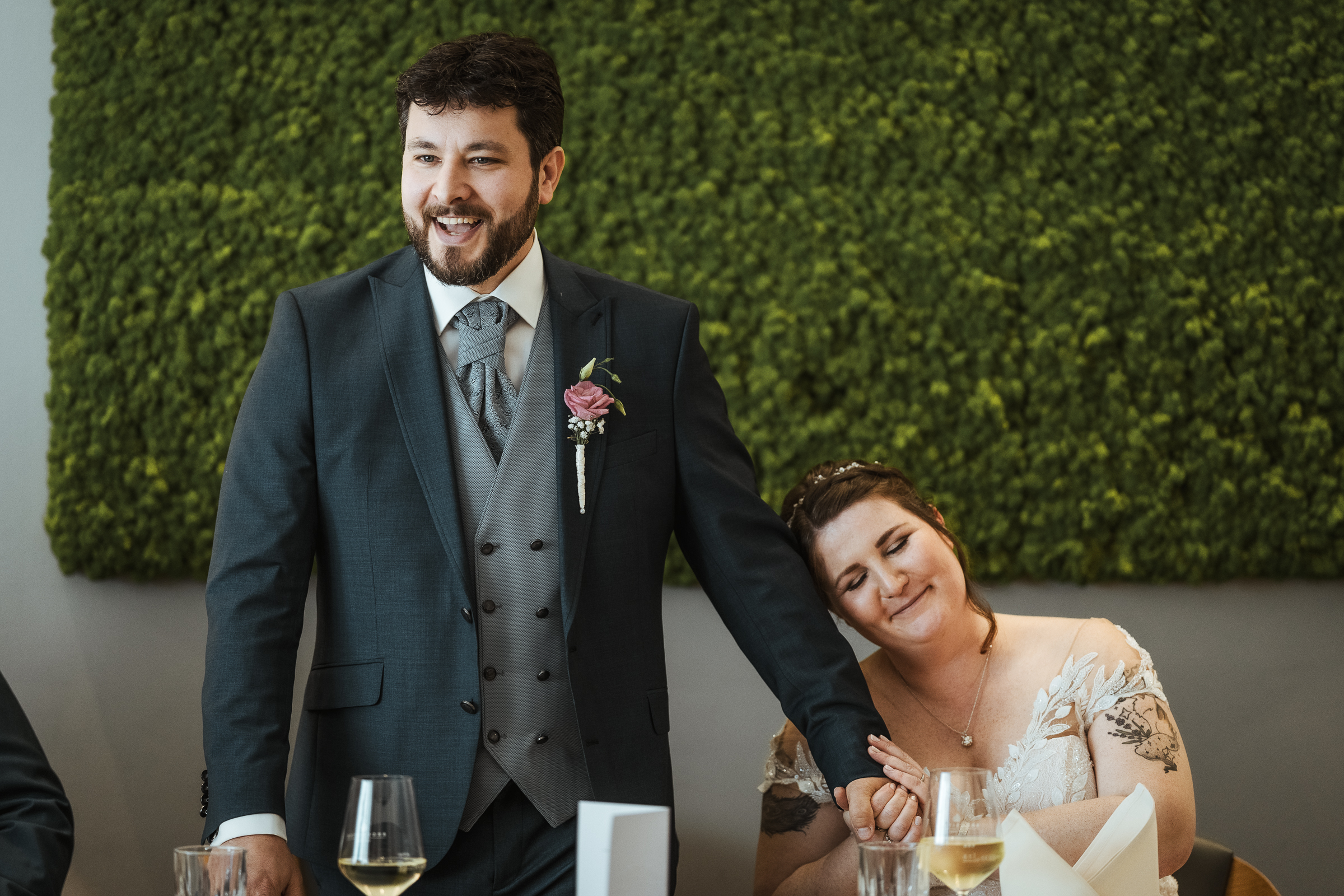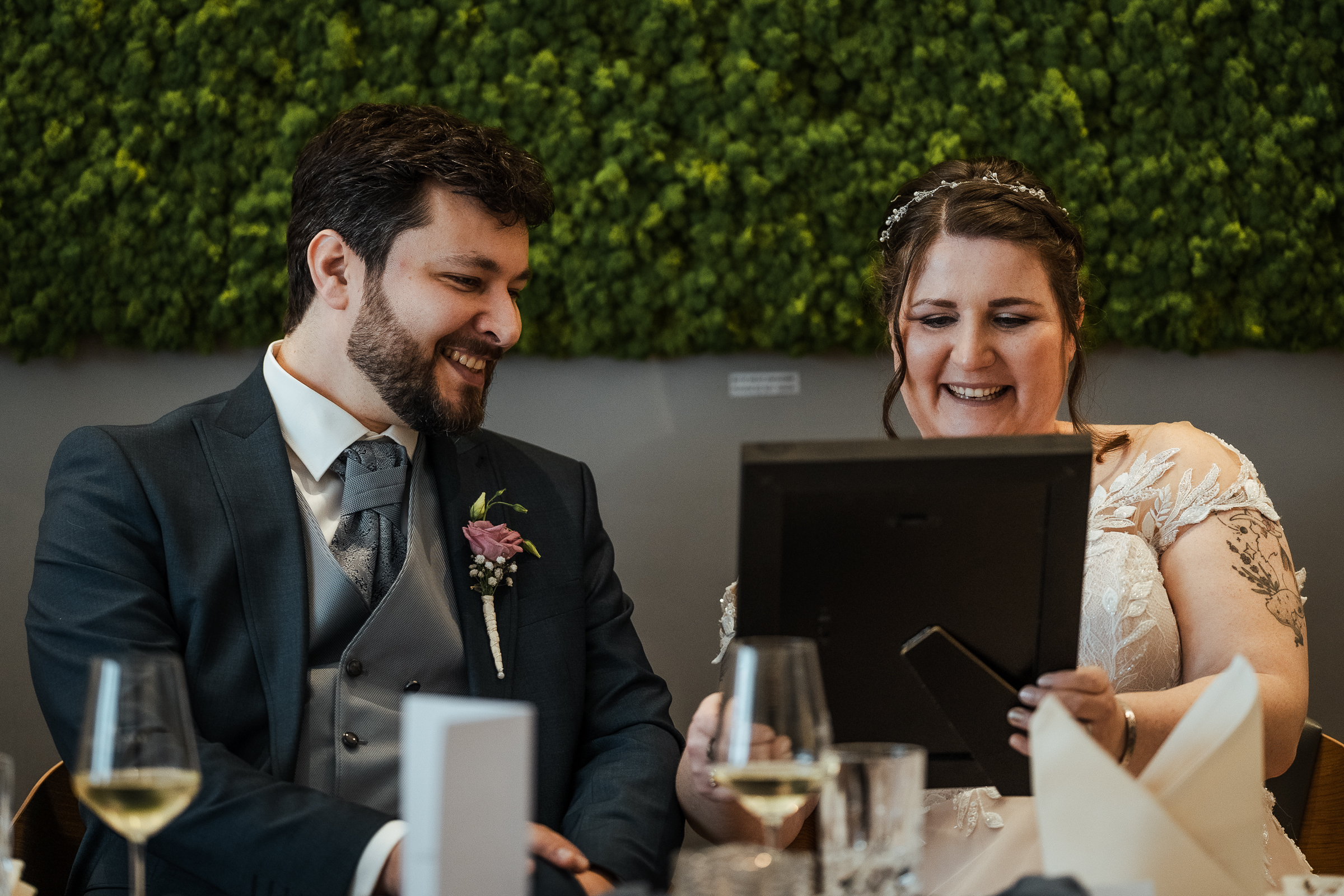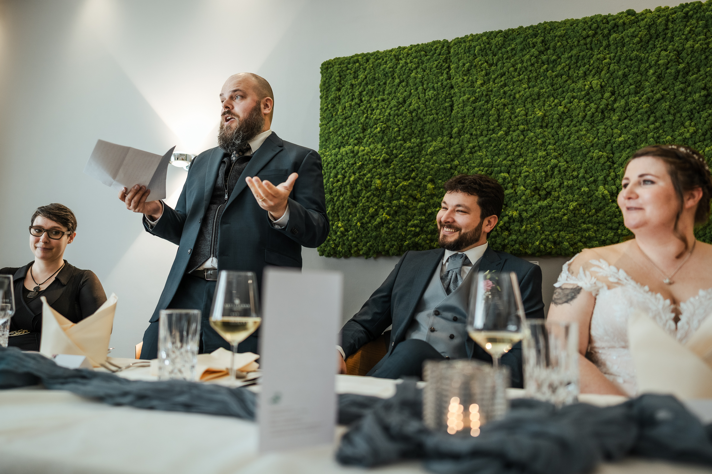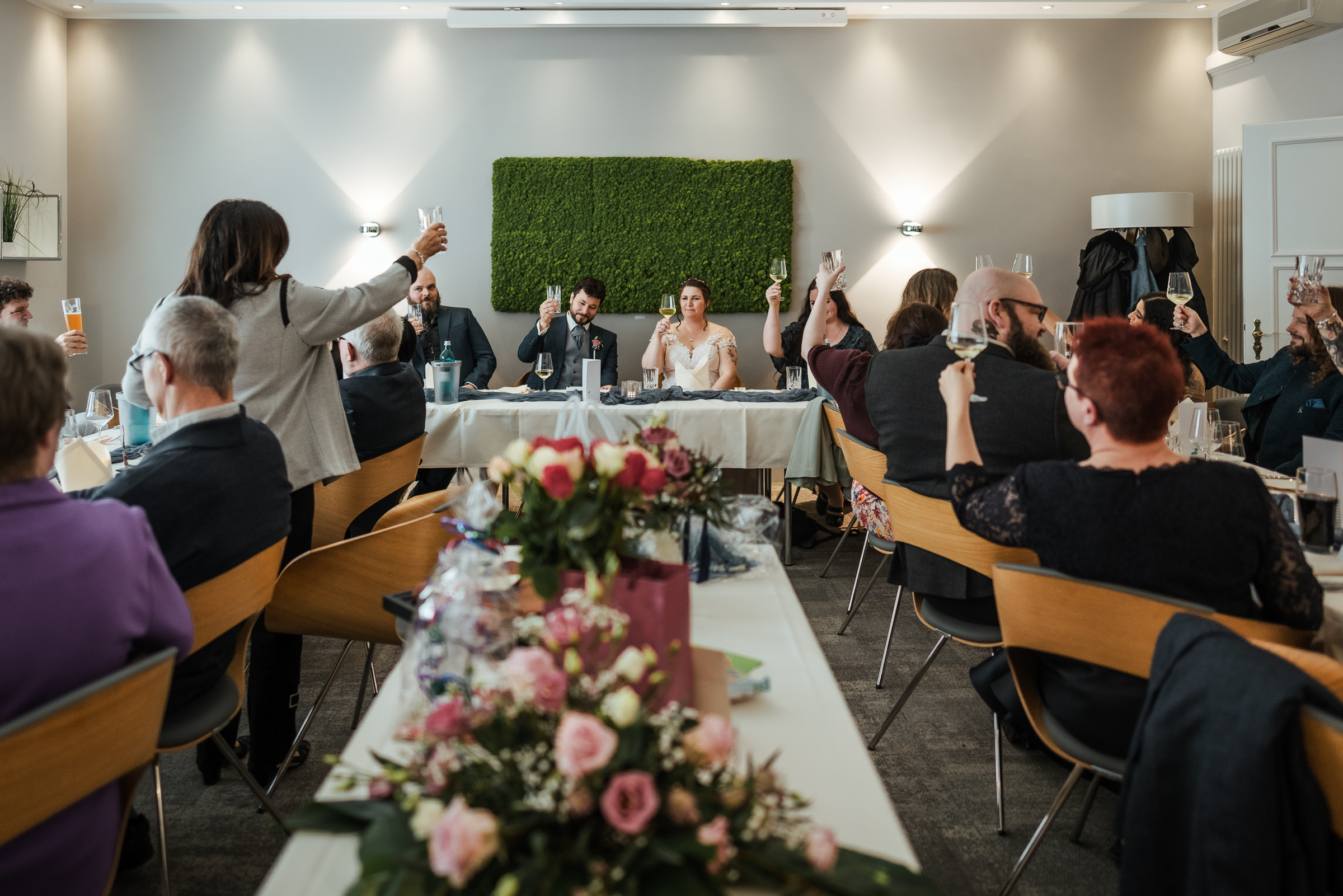 Die anschließende Feier fand im Hotel Insel in Bonn-Bad Godesberg statt. Bei gutem Essen, liebevoller Dekoration und einer köstlichen Hochzeitstorte wurde ausgelassen gefeiert. Besonders berührend waren die Reden der Trauzeugen und Eltern, die das Brautpaar mit persönlichen Worten, Erinnerungen und viel Humor ehrten.