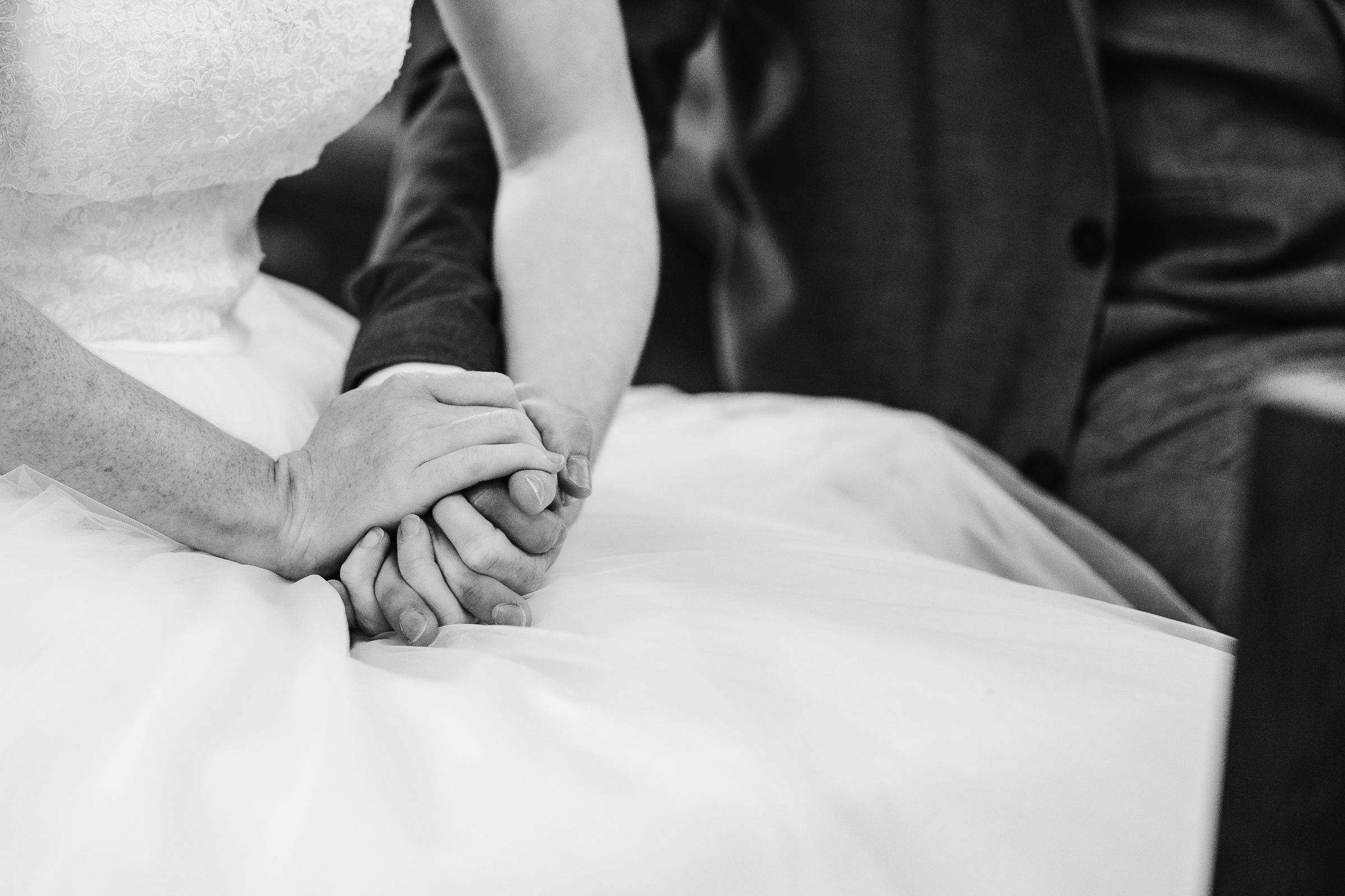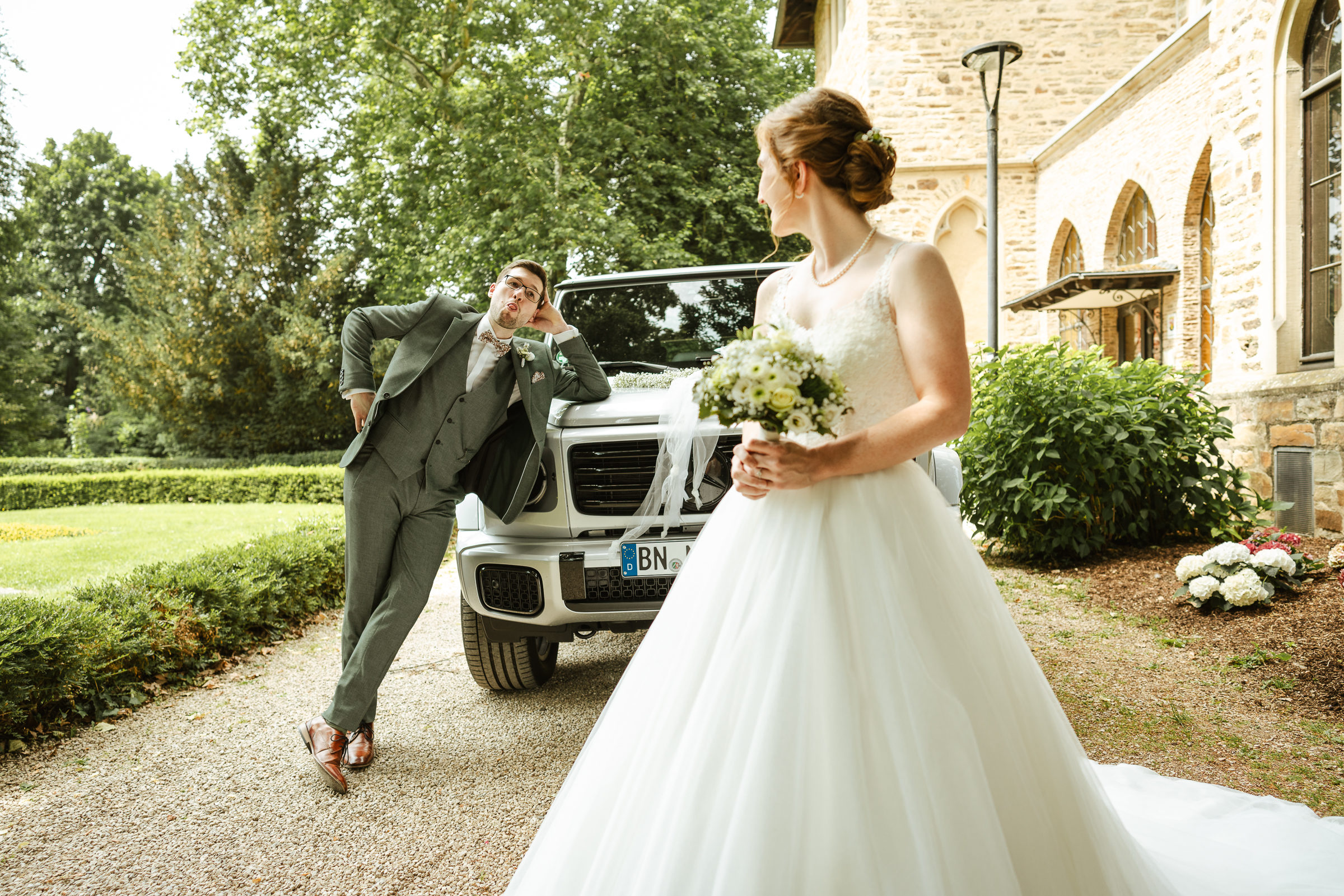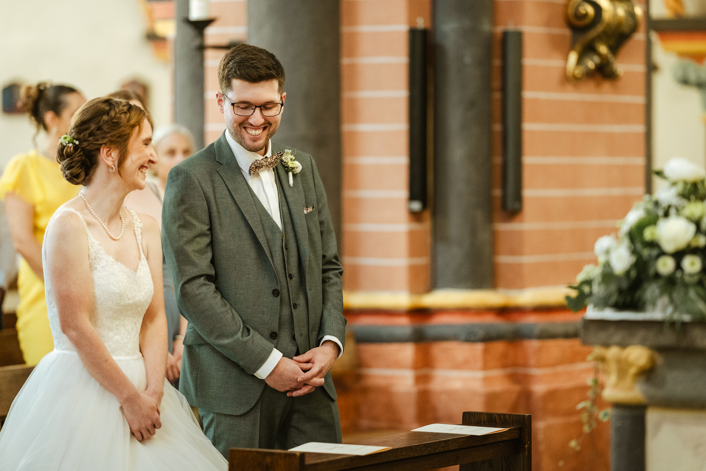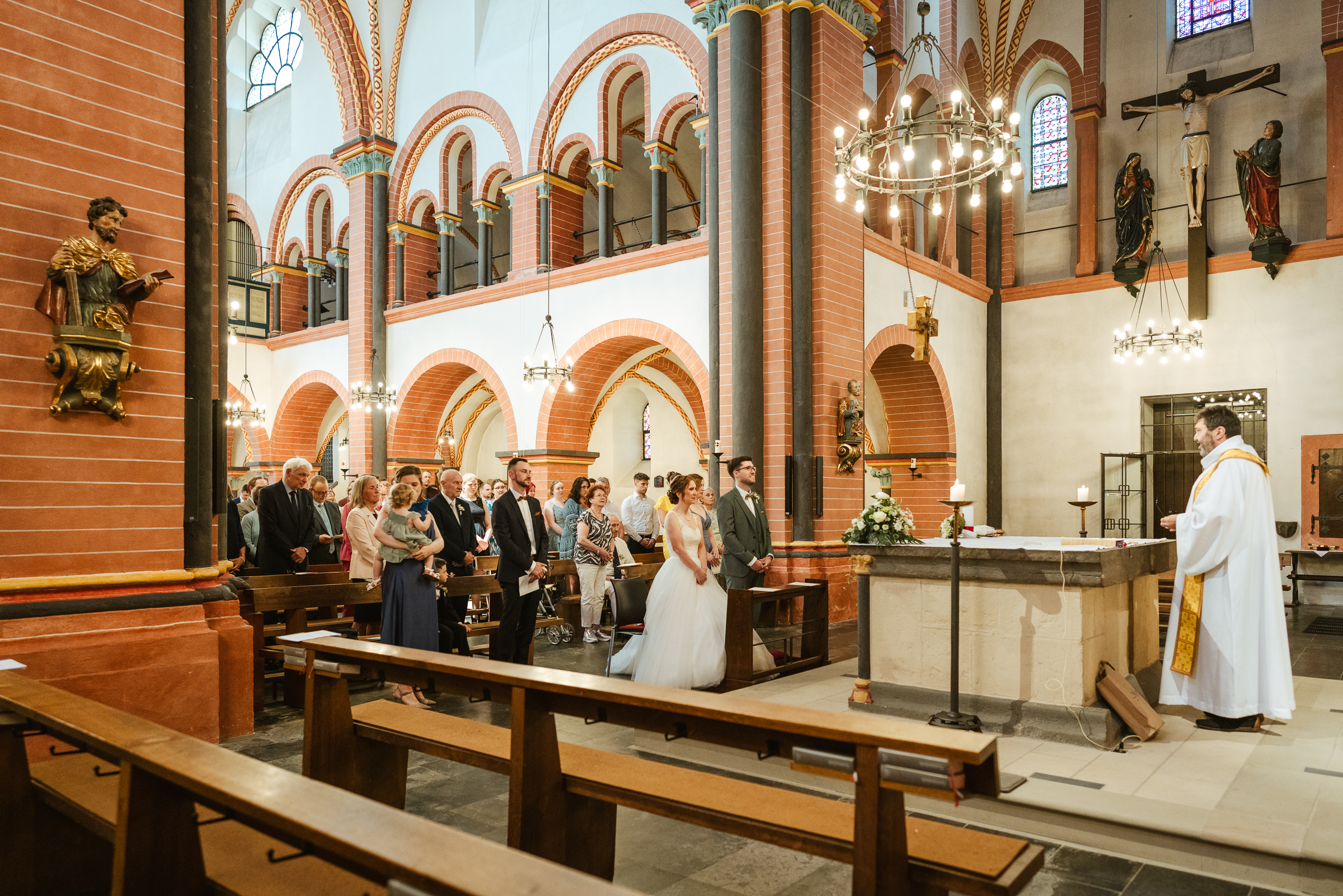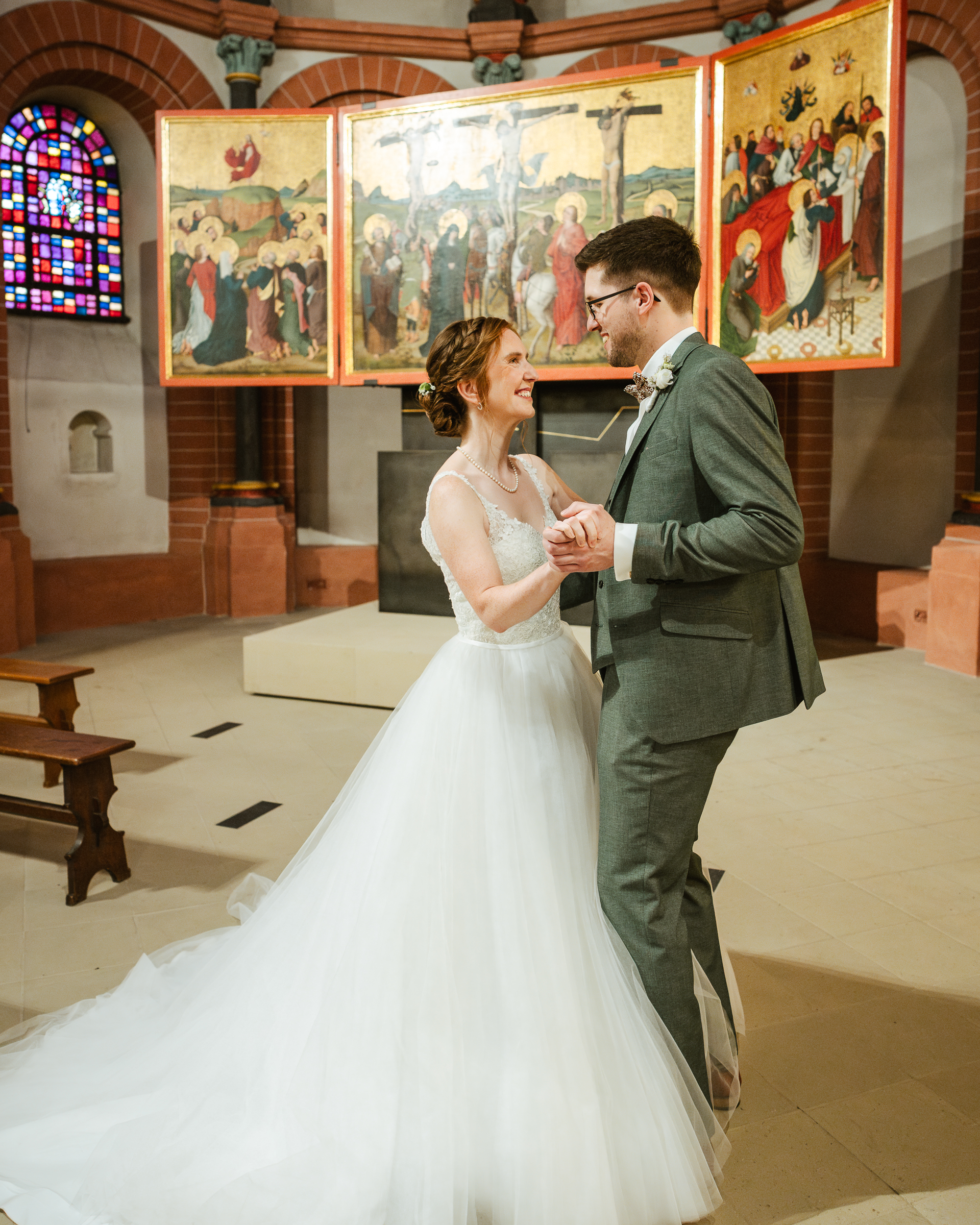 Da es an diesem Tag sehr warm war, setzten wir die Brautpaarfotos in der Sinziger Kirche fort. Die katholische Pfarrkirche St. Peter, ein beeindruckendes Bauwerk aus dem 13. Jahrhundert, bot nicht nur eine angenehm kühle Atmosphäre, sondern auch eine ganz besondere Stimmung. Mit einem Paar, das so viel lacht wie Andrea und Jan, sind authentische Bilder garantiert. Selbst im Chor der Kirche wagten die beiden ein paar Tanzschritte – ein wunderschöner, lebendiger Moment, der ihre Leichtigkeit und Verbundenheit perfekt widerspiegelte.