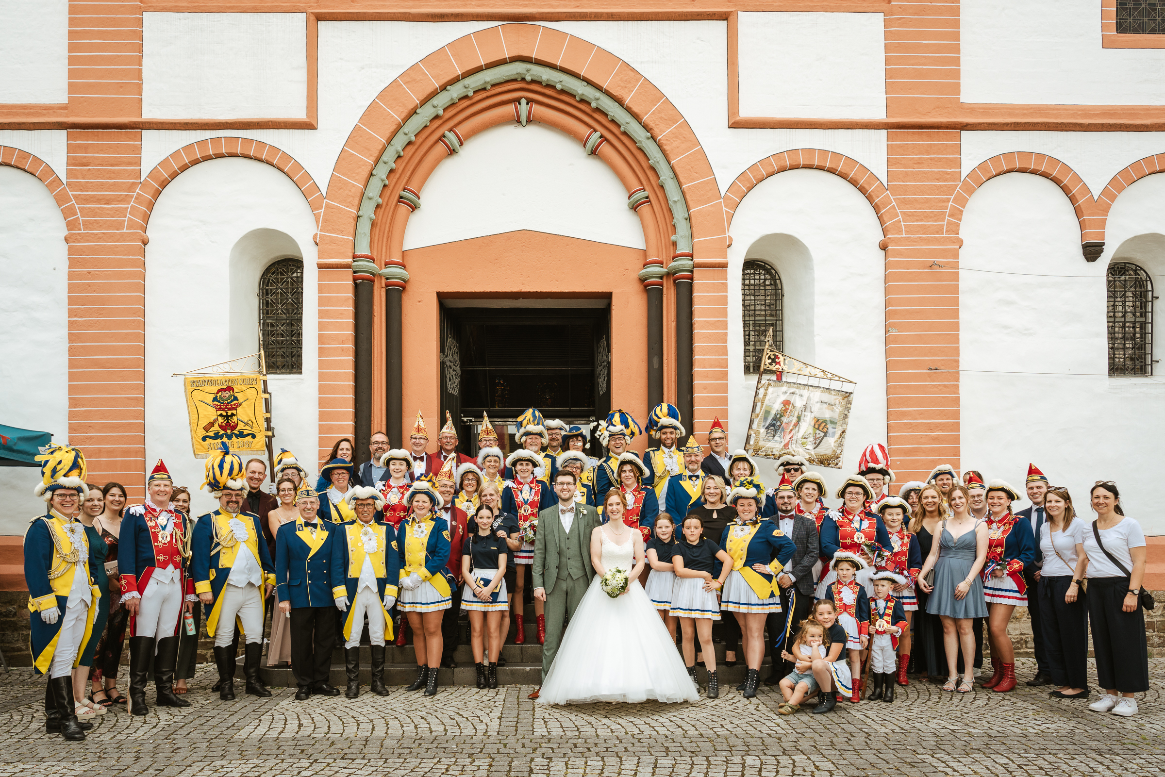 Nach der Trauung erwartete das frisch vermählte Paar vor der Kirche ein beeindruckendes Spalier. Der Kirchplatz erstrahlte in kräftigen Farben: Blau-Gelb der Karnevalsgesellschaft „Närrische Buben“ aus Sinzig und Blau-Rot der Karnevalsgesellschaft Bad Breisig prägten das Bild.
