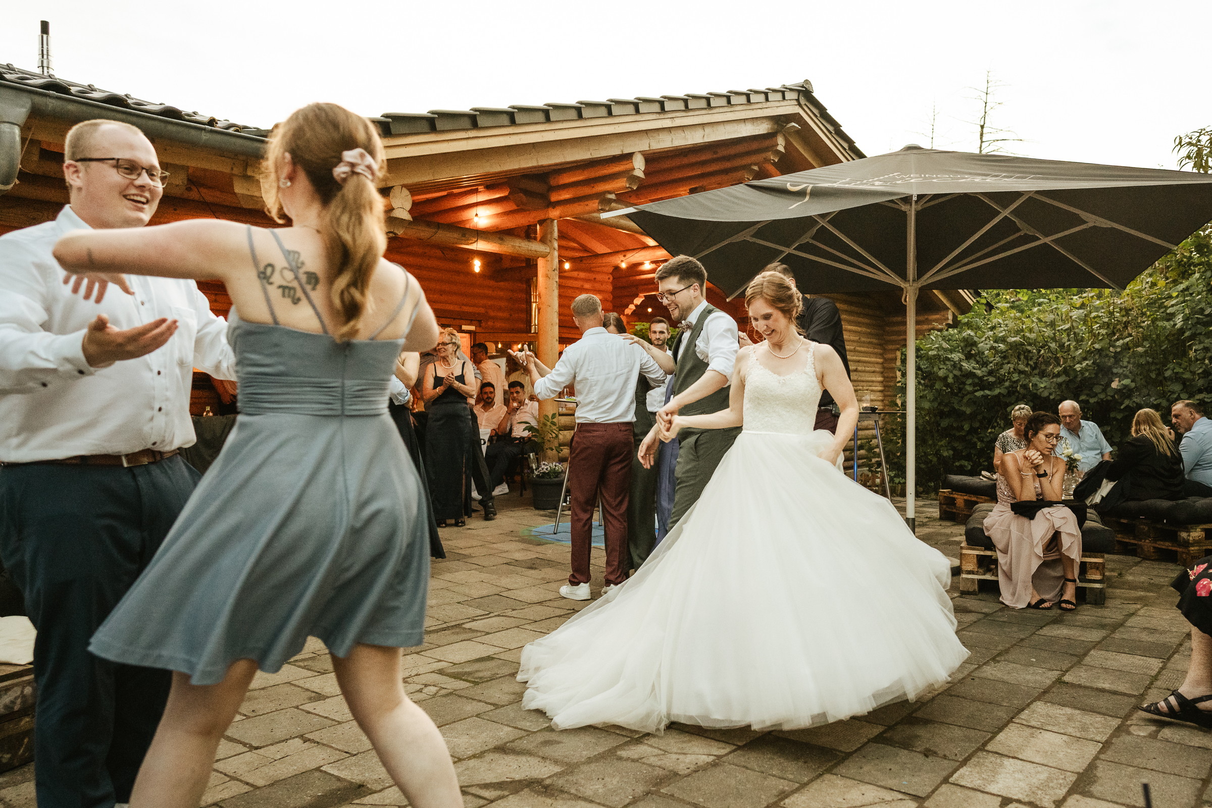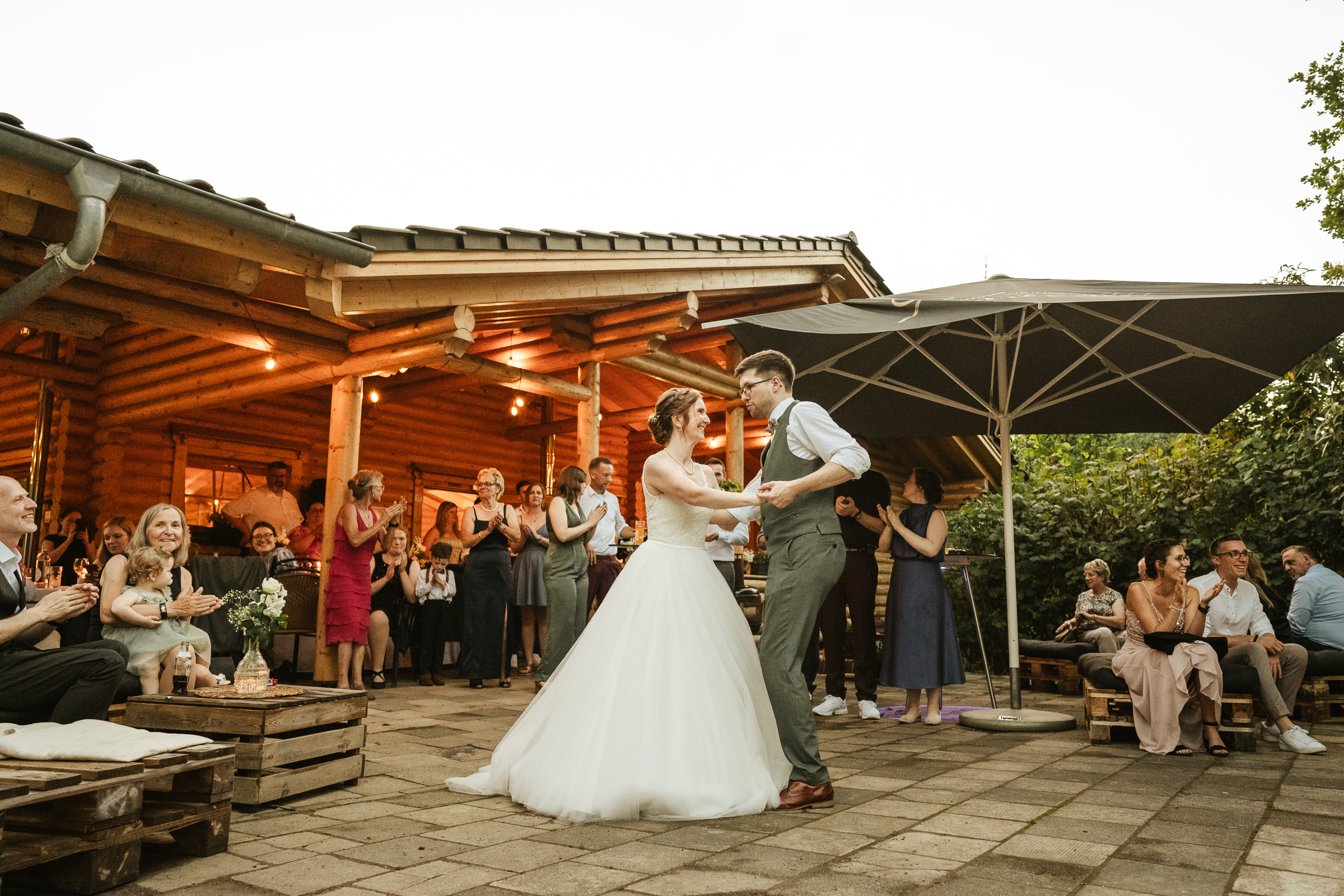 Gefeiert wurde anschließend auf der Cäciliahütte nahe dem Feltenturm. Hoch oben auf dem Mühlenberg bietet sich eine beeindruckende Aussicht über Sinzig und das angrenzende Rheintal – eine traumhafte Kulisse für eine ausgelassene Hochzeitsfeier.