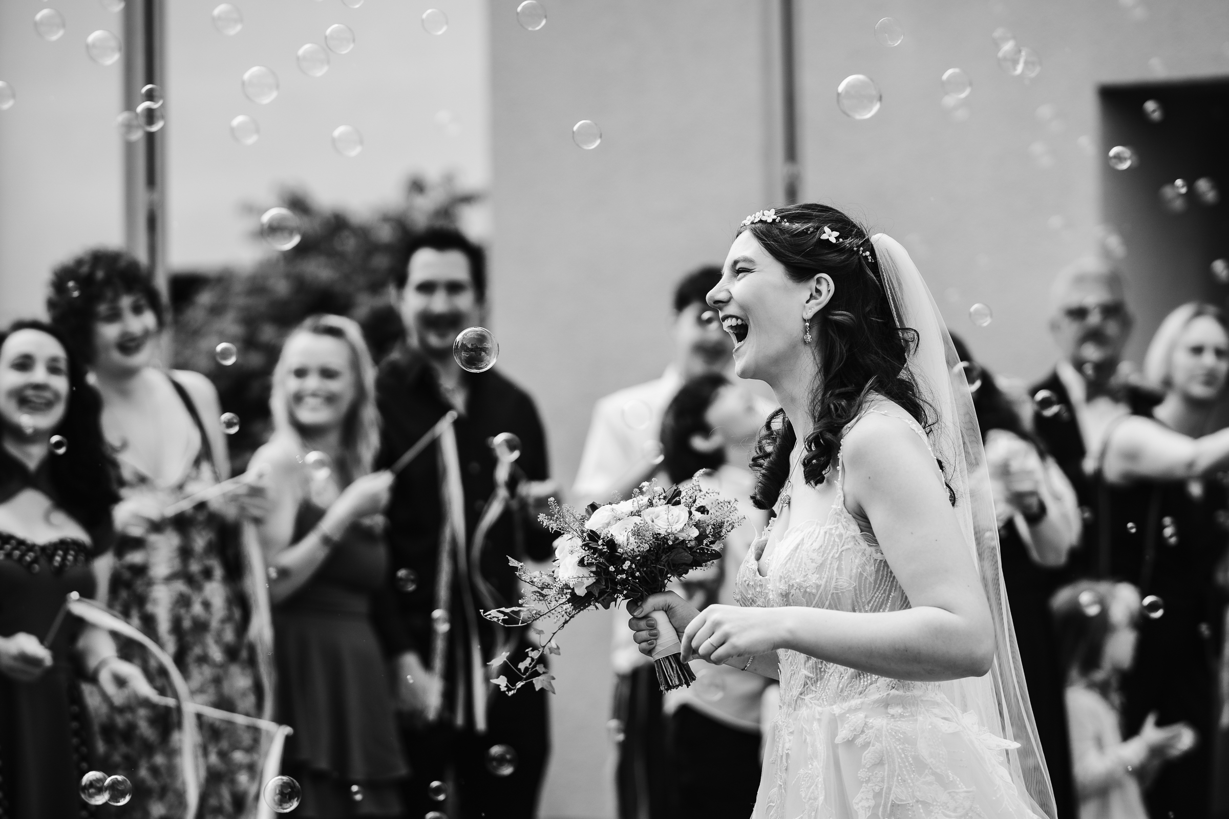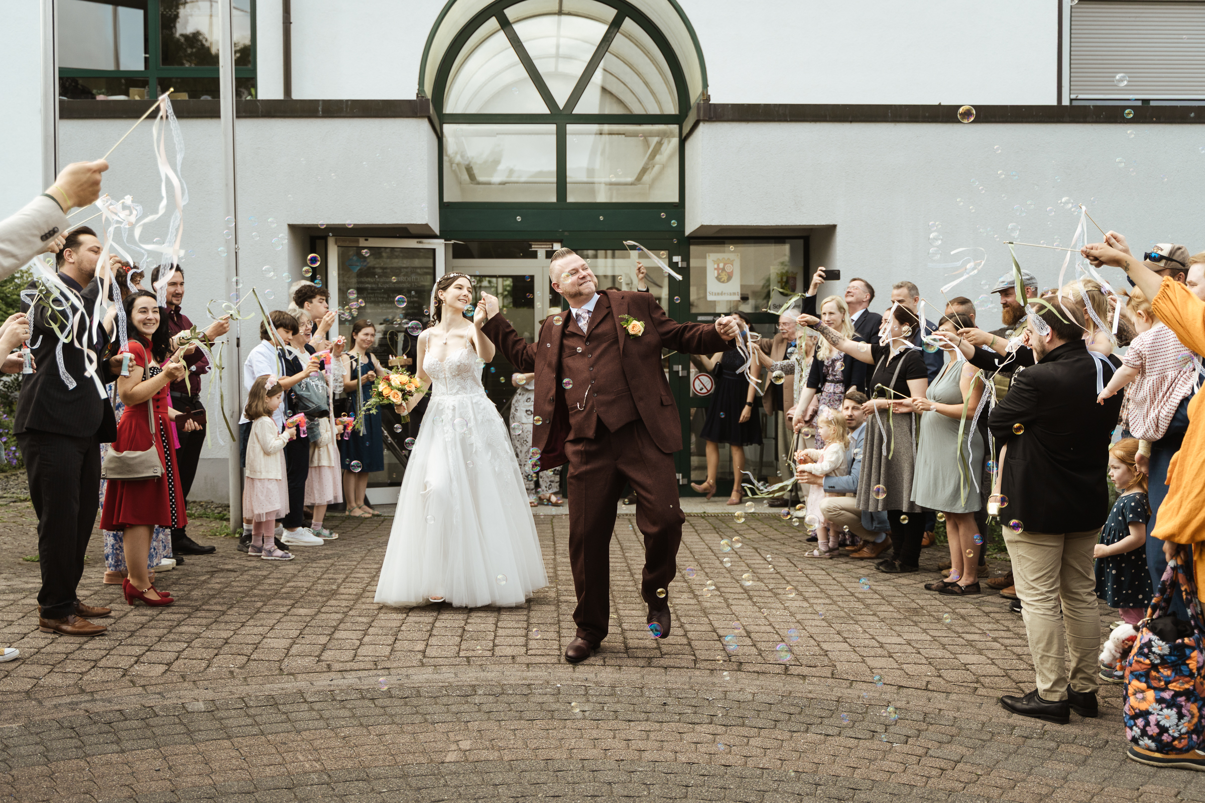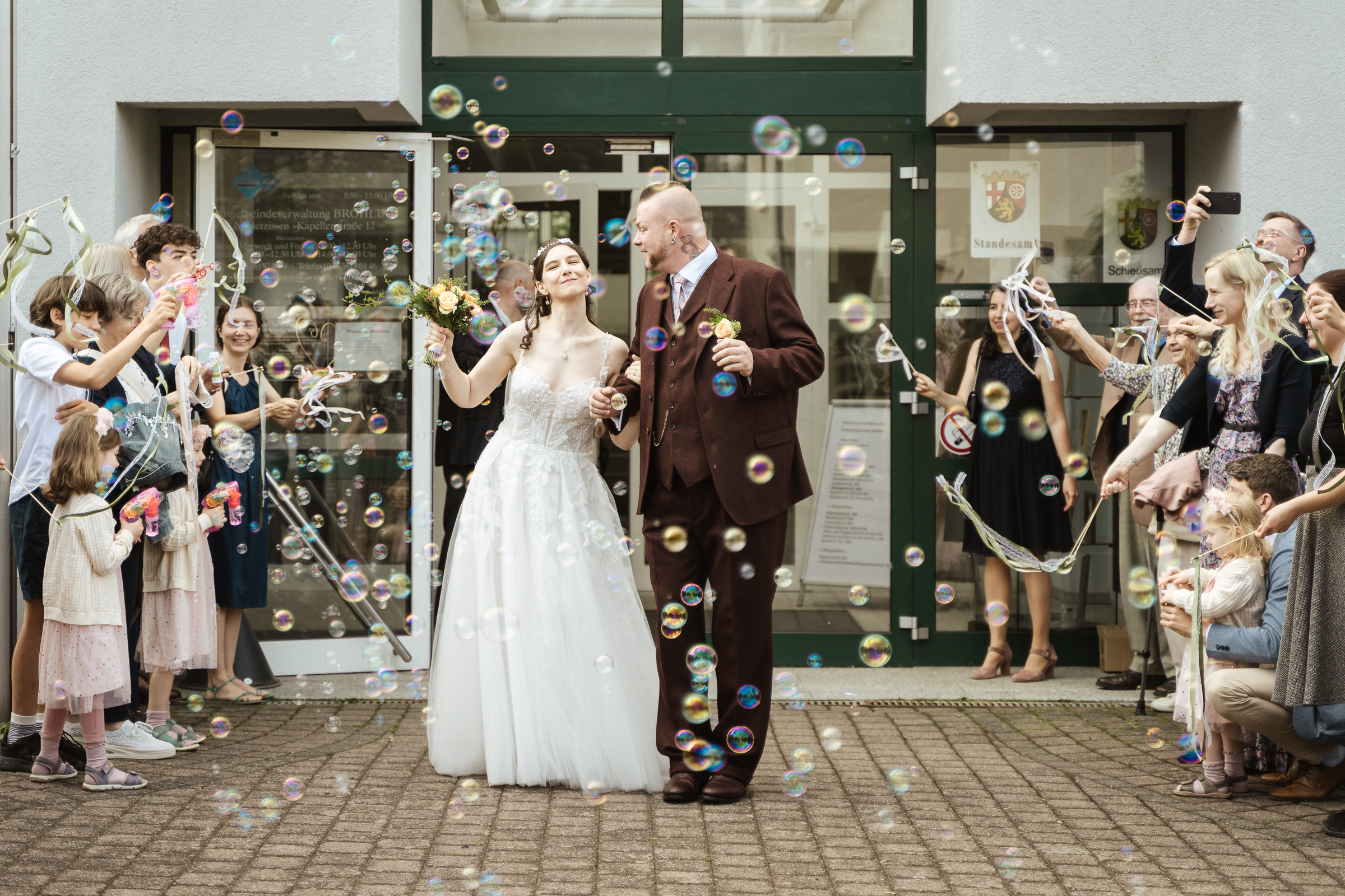 Noch im Standesamt nahmen sich Tinker und Tobi Zeit, die Glückwünsche ihrer Familie und Freunde entgegenzunehmen – begleitet von bewundernden Blicken und ganz viel Freude. Anschließend ging es nach draußen, wo die beiden von einem Spalier aus jubelnden Gästen empfangen wurden. Seifenblasen schwebten durch die Luft und verliehen dem Auszug eine fast magische Stimmung – ein wunderschönes Detail, das den Moment nicht nur emotional, sondern auch fotografisch ganz besonders gemacht hat.