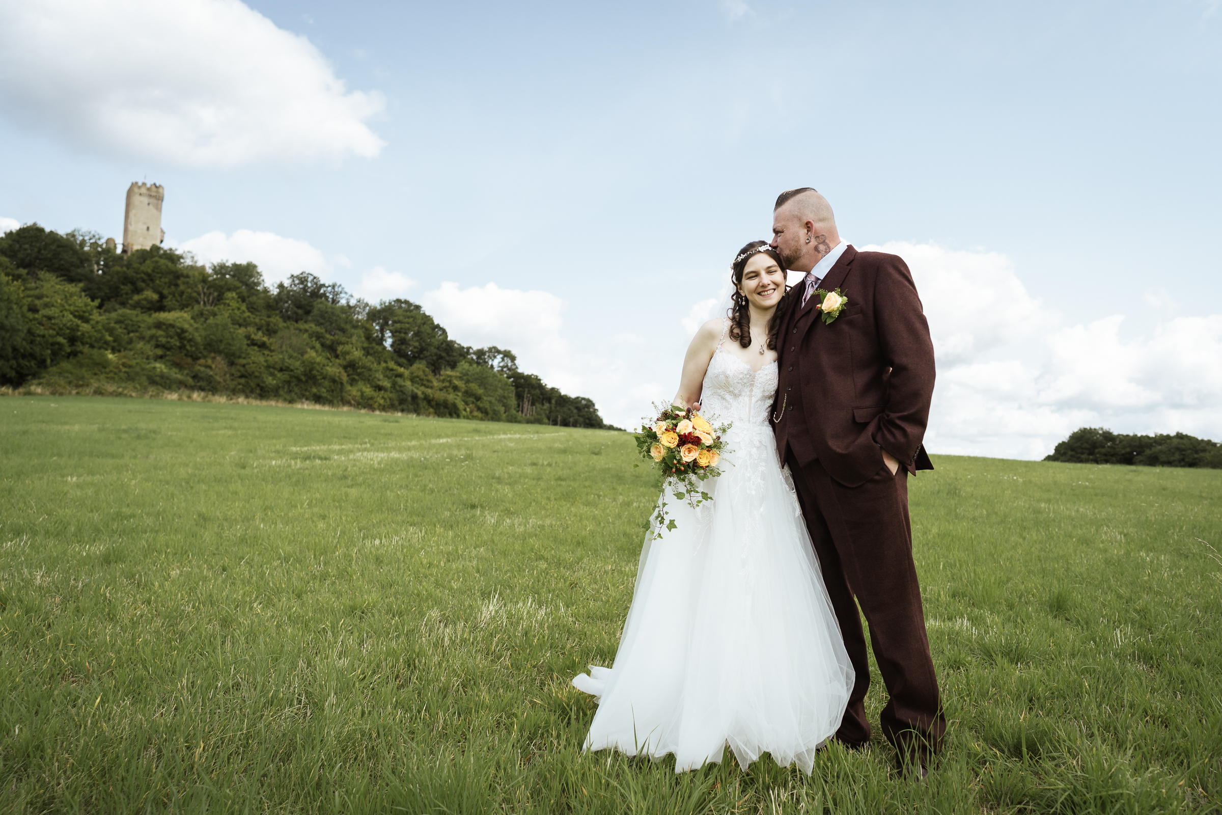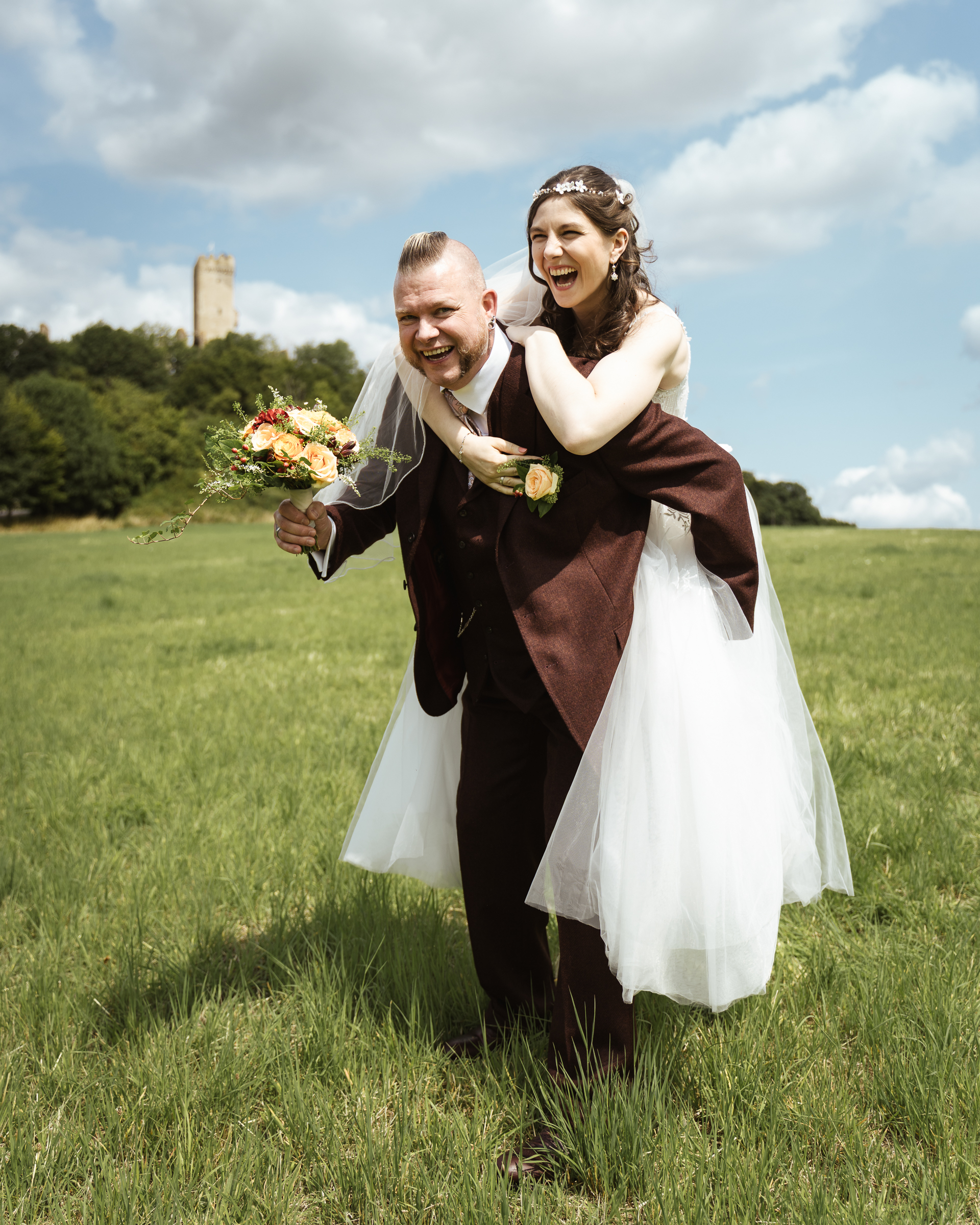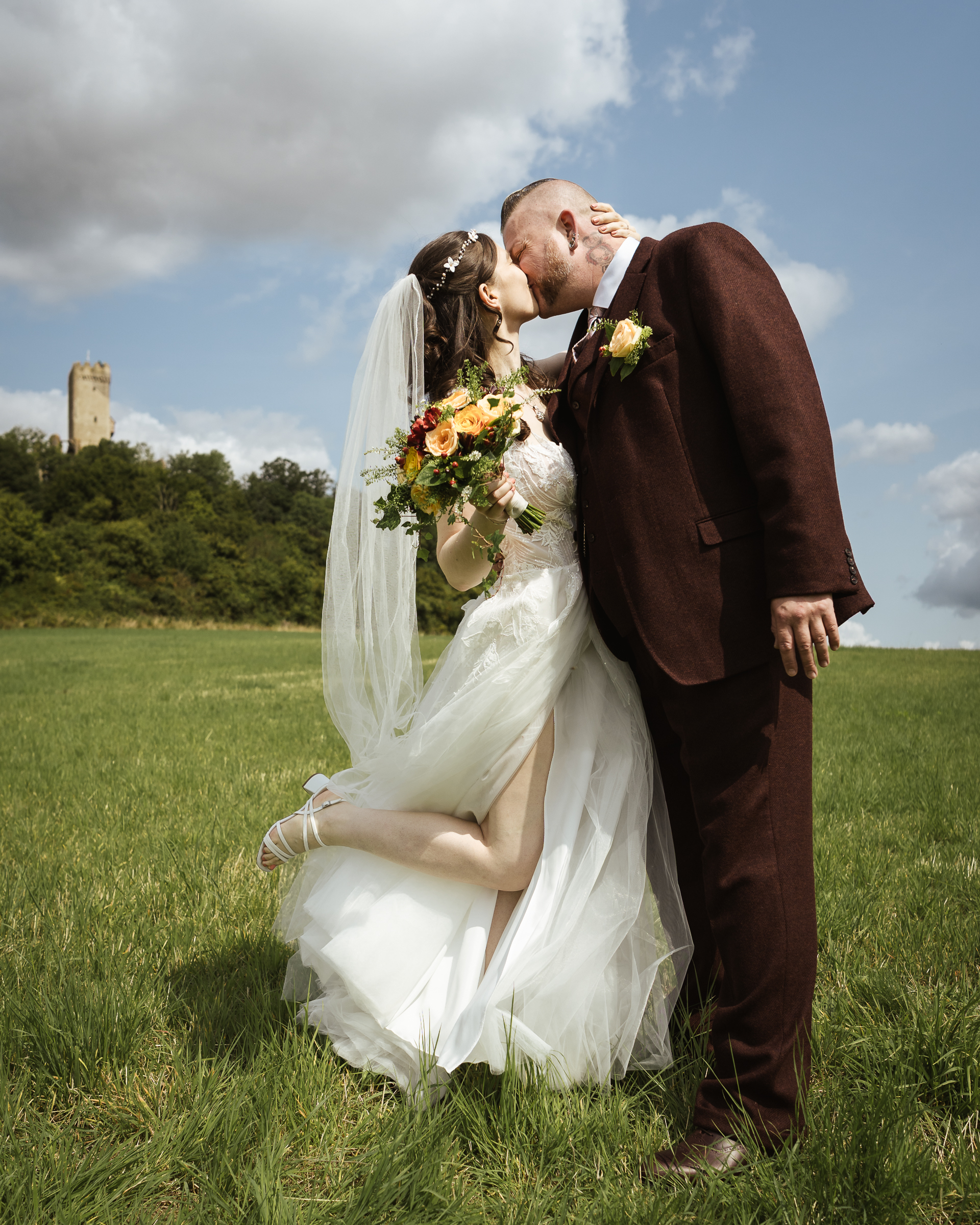 Von Niederzissen aus fuhren wir weiter nach Hain, wo wir auf einer Wiese unterhalb der beeindruckenden Burg Olbrück die Brautpaarfotos gemacht haben. Diese Kulisse, kombiniert mit dem weiten Blick über die Eifellandschaft, war wie gemacht für Tinker und Tobi. Die beiden waren einfach wundervoll: verliebt, voller Lebensfreude und mit einer ansteckenden Leichtigkeit, die jedes Foto natürlich und authentisch wirken ließ. Sie hatten sichtbar Spaß – und genau das spiegelt sich in den Bildern wider.