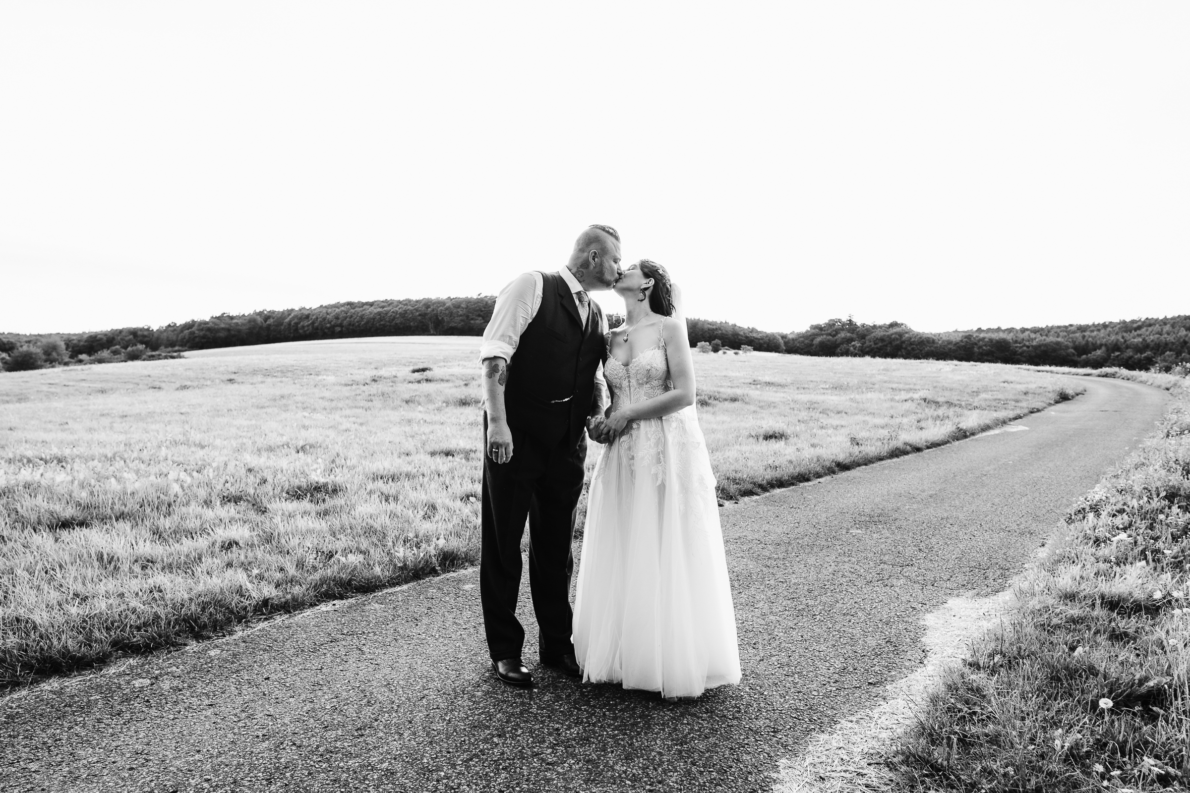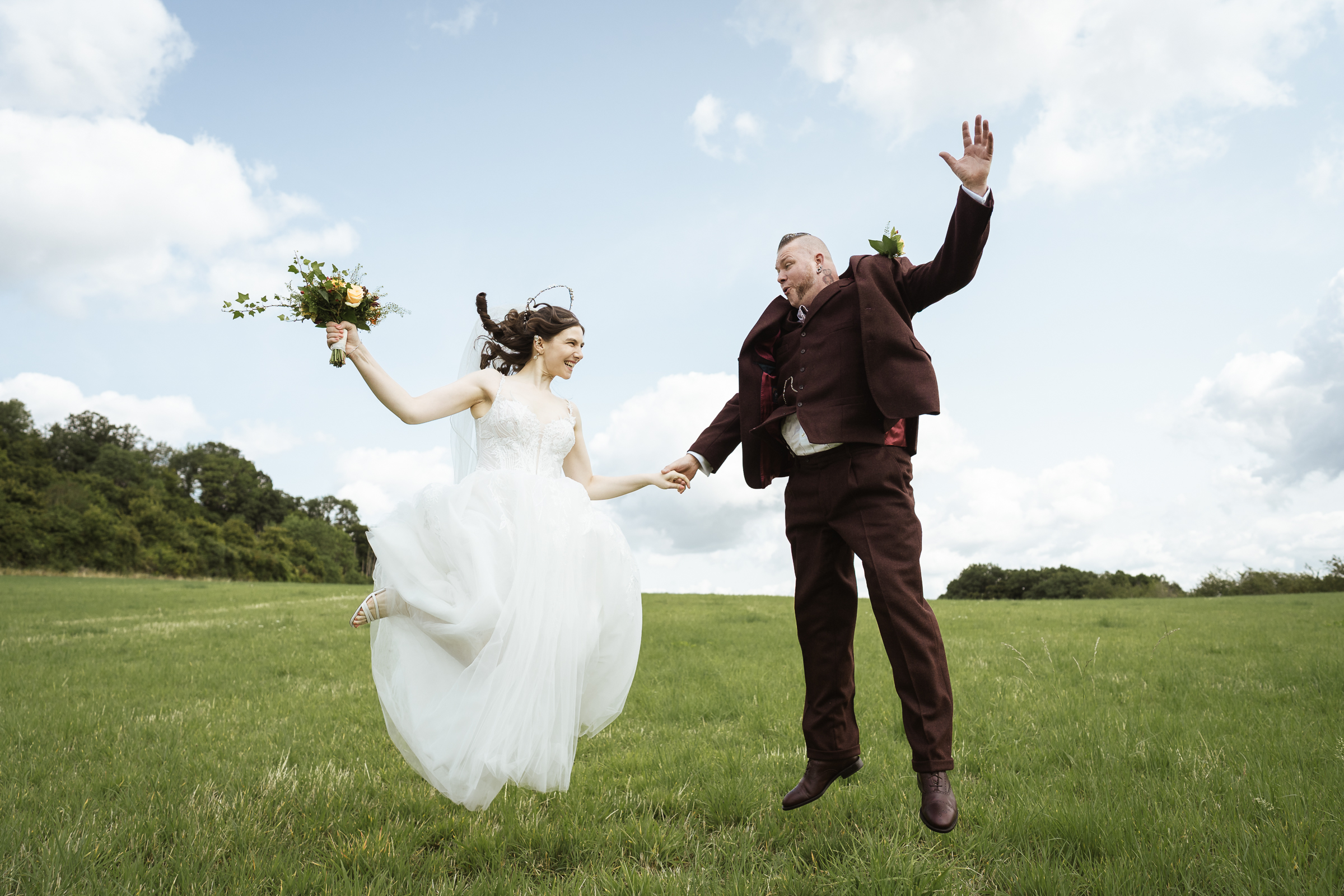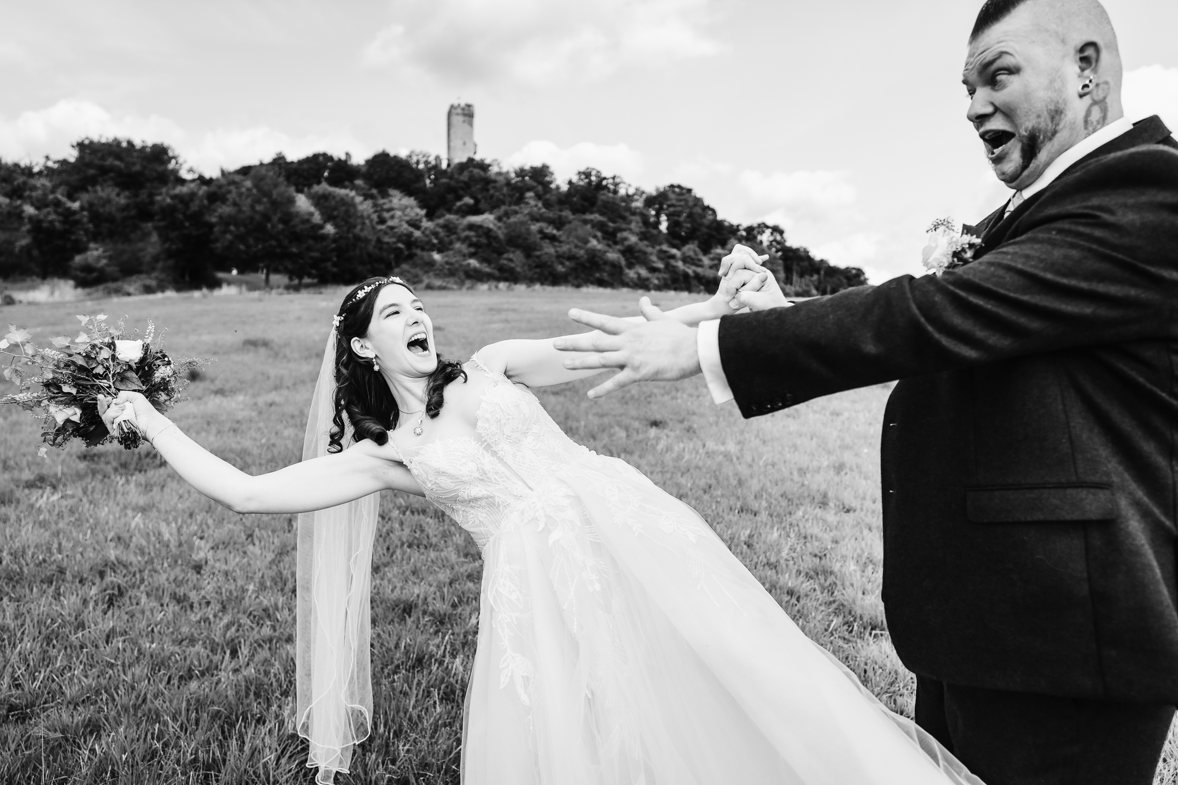 Von Niederzissen aus fuhren wir weiter nach Hain, wo wir auf einer Wiese unterhalb der beeindruckenden Burg Olbrück die Brautpaarfotos gemacht haben. Diese Kulisse, kombiniert mit dem weiten Blick über die Eifellandschaft, war wie gemacht für Tinker und Tobi. Die beiden waren einfach wundervoll: verliebt, voller Lebensfreude und mit einer ansteckenden Leichtigkeit, die jedes Foto natürlich und authentisch wirken ließ. Sie hatten sichtbar Spaß – und genau das spiegelt sich in den Bildern wider.