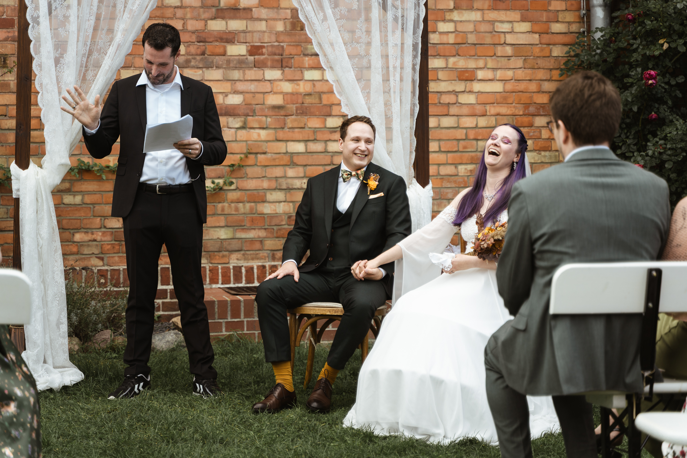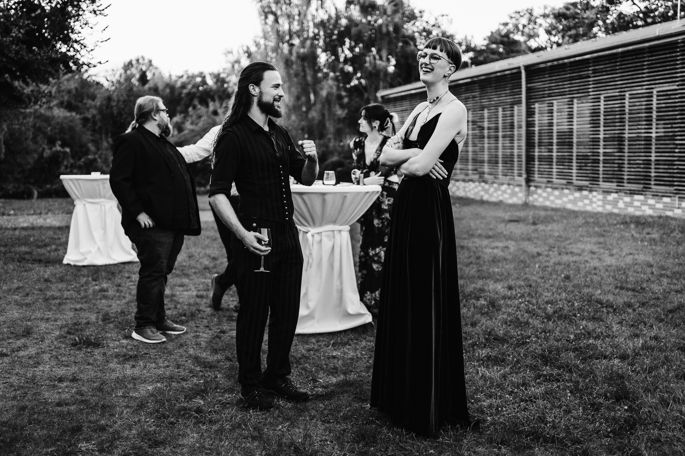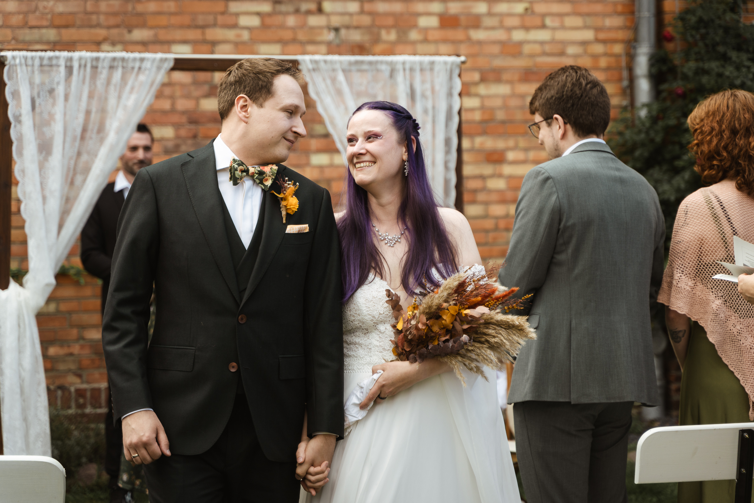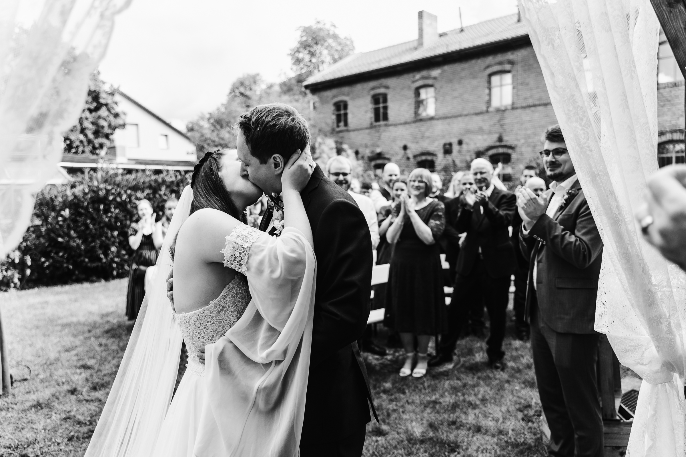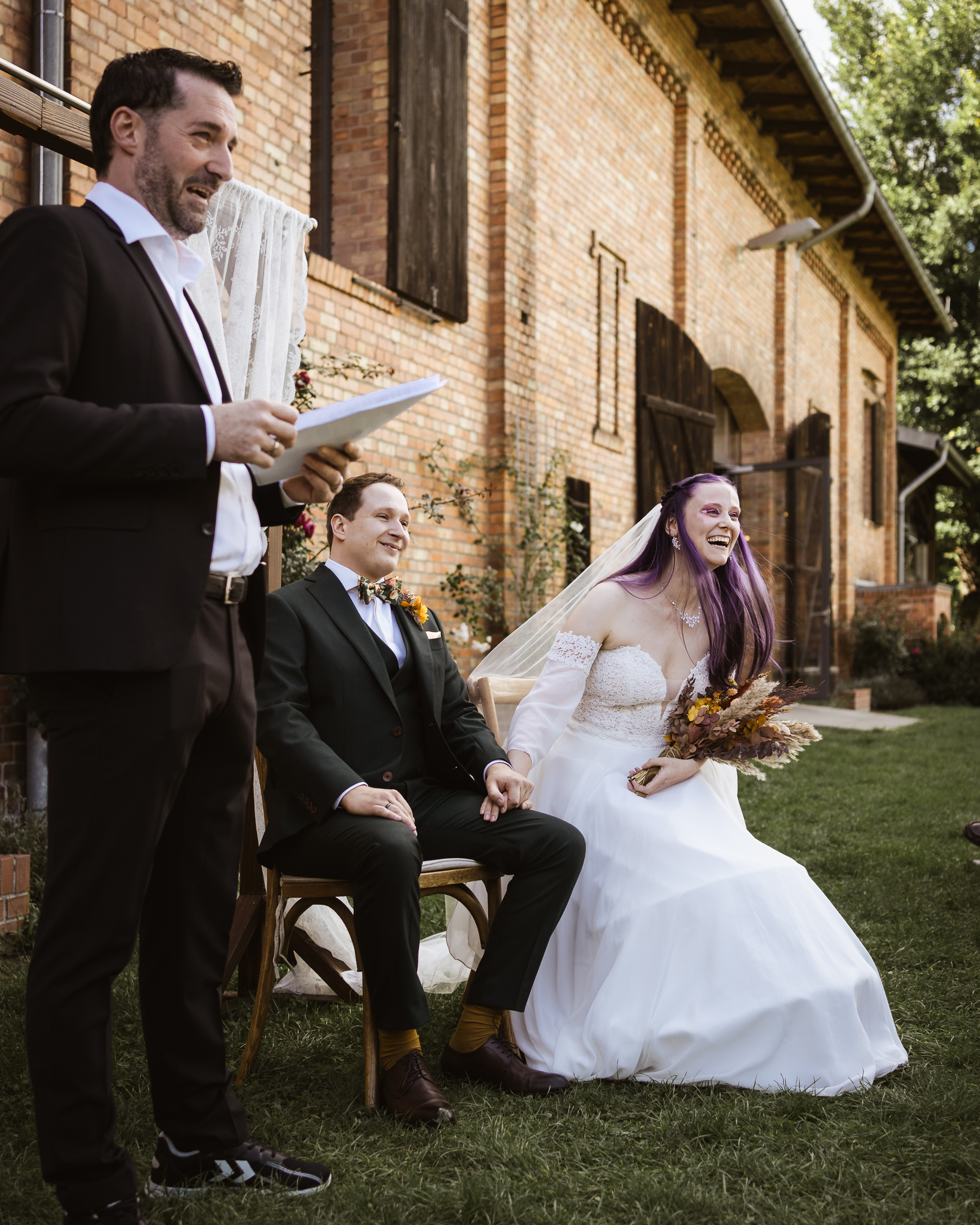 Die freie Trauung fand im Garten hinter dem Restaurant „Zum Speicher“ auf dem Stadtgut Berlin Buch statt. Inmitten von Familie und Freunden gaben sich Martha und Jakob das Ja-Wort. Die Atmosphäre war emotional, herzlich und voller Nähe. Man spürte, wie eng die Beziehung des Paares zu ihren Gästen ist – bei den liebevollen Blicken, den Umarmungen und den ehrlichen Glückwünschen.