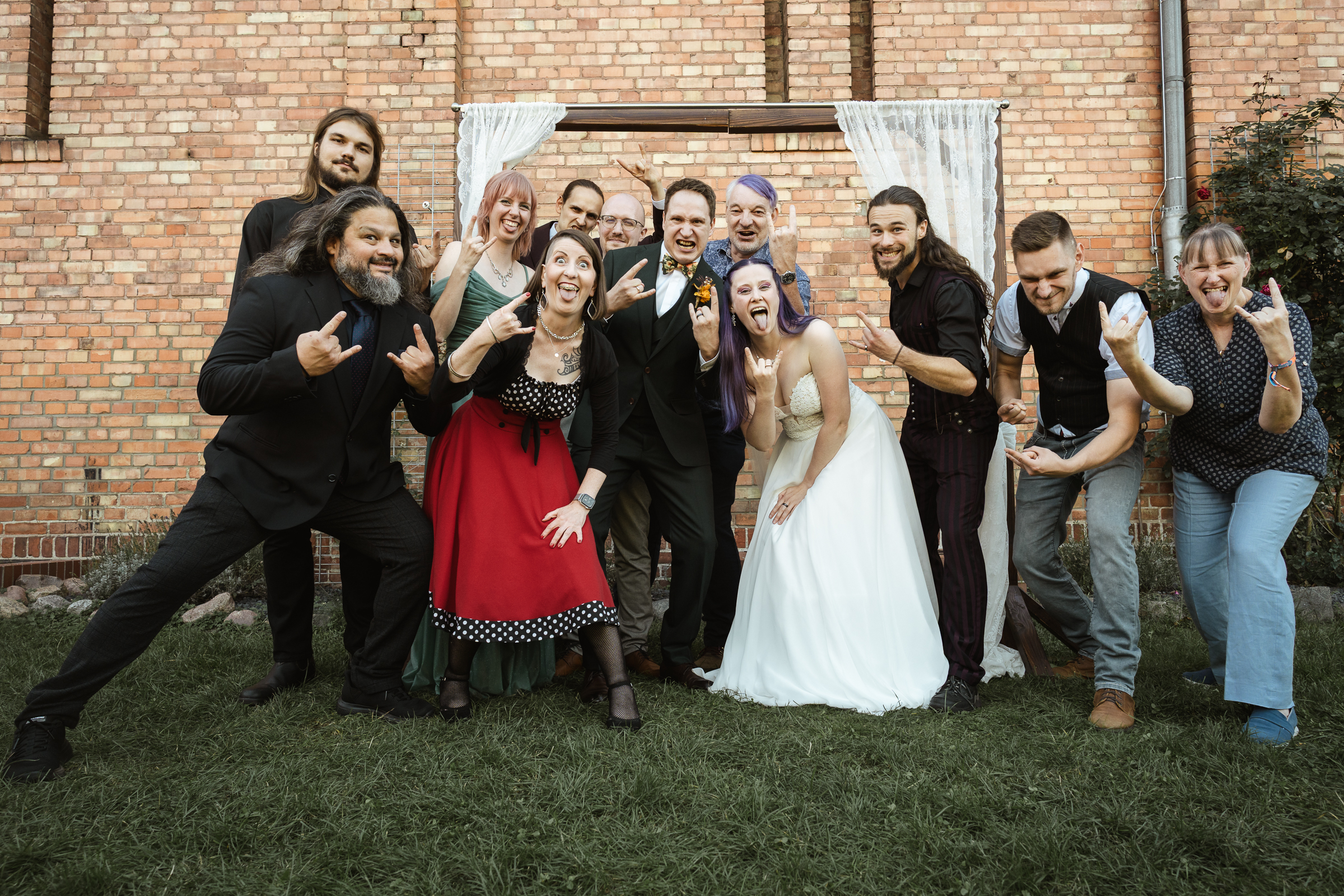 Auch bei den Gruppenfotos zeigte sich Martha und Jakob von ihrer ganz unverkrampften Seite. Lachen, Nähe und echte Verbundenheit bestimmten die Bilder – genauso wie ein Augenzwinkern in Richtung ihrer Leidenschaft für Heavy-Metal-Musik. Eine Hochzeit, die nicht geschniegelt sein musste, sondern authentisch und echt.